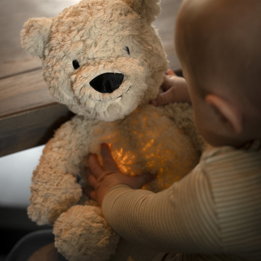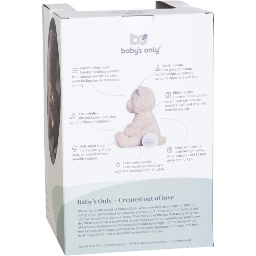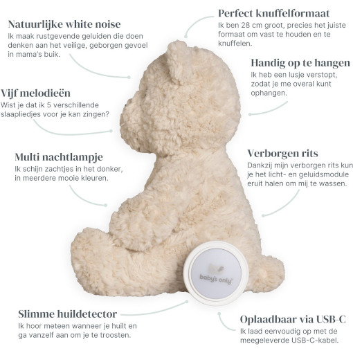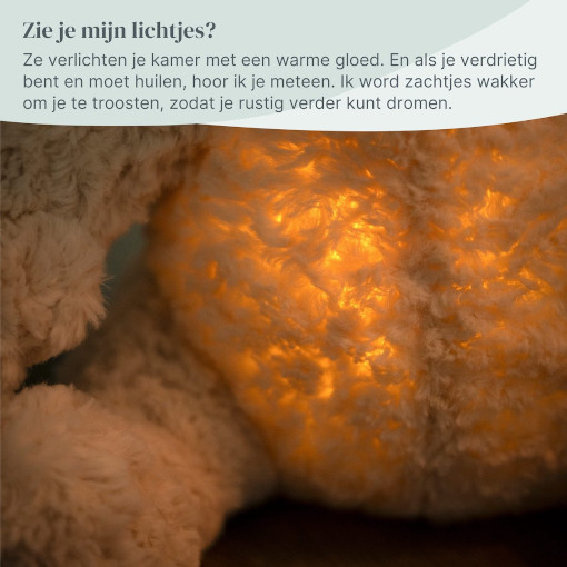 Ik ben gemaakt om met je mee te groeien. In het begin help ik met mijn geluidjes en warme lichtje. Word je groter? Dan haal je mijn module eruit en blijf ik gewoon jouw vertrouwde knuffelvriend. Zonder elektronica, maar met alle herinneringen die we samen maken.