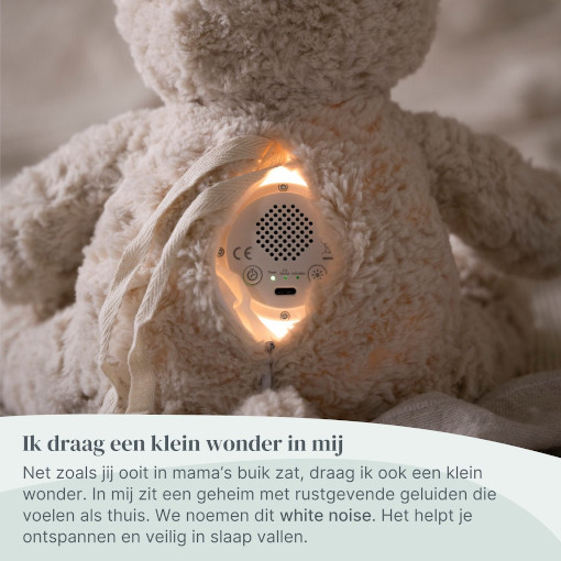 Net zoals jij ooit in mama’s buik zat, draag ik ook een wondertje met me mee. In mijn buik zit een klein geheim: ik maak geluidjes die klinken zoals het geluid in mama’s buik. Dat noemen we white noise. Die vertrouwde klanken helpen jou ontspannen en geven een veilig en geborgen gevoel.