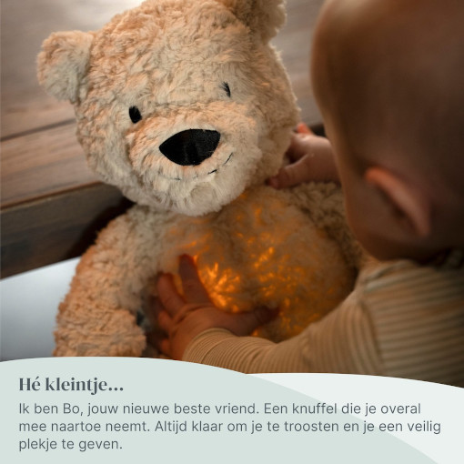 Bo is een knuffelvriend met white noise, melodieën, natuurgeluiden, nachtlampje, huildetector en USB-C opladen die zorgt voor rust, geborgenheid en troost.