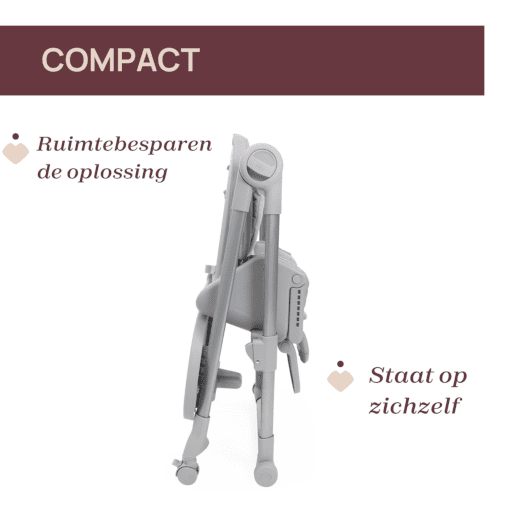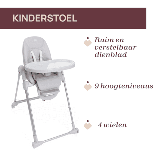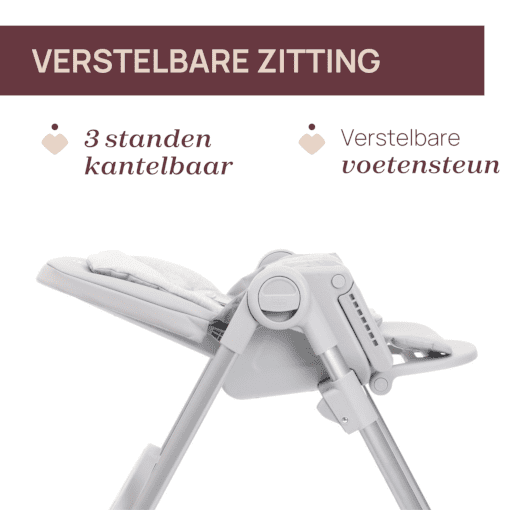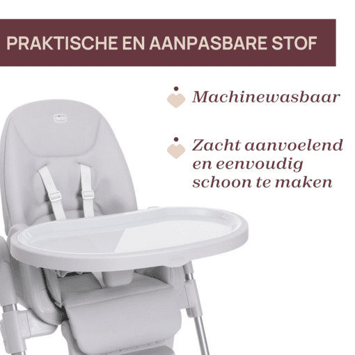 Volledig verstelbaar: 9 verschillende hoogtes om aan te passen aan verschillende tafeltypen. De voetensteun en het dienblad kunnen ook worden aangepast om mee te groeien met de behoeften van het kind.