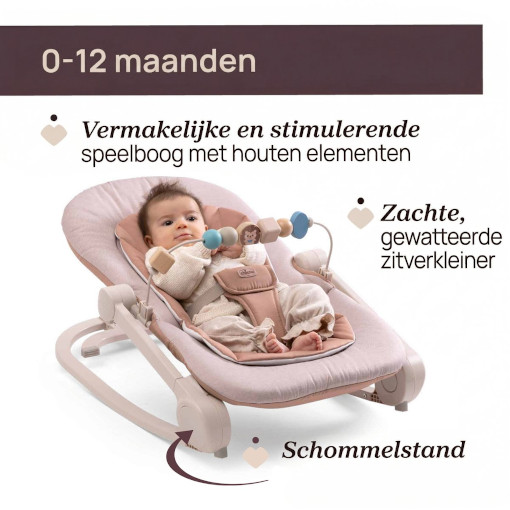Gun je baby een veilige, comfortabele plek om te ontspannen én te ontdekken met de Chicco Magia Wipstoel in de warme kleur Terracotta. Deze stijlvolle wipstoel combineert rust, ondersteuning en spel in één, en groeit moeiteloos mee van pasgeboren baby tot peuter.